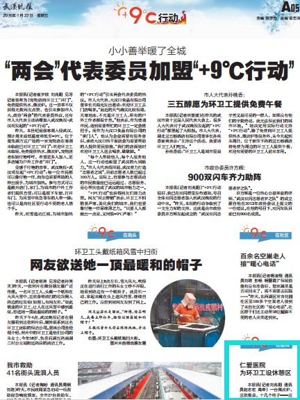 武漢晚報 本報訊(記者劉兆陽 通訊員趙志宏 高牽)一臺微波爐、三張餐桌、十幾個椅子這個樸素而溫馨的角落,是仁愛醫(yī)院專為環(huán)衛(wèi)工而設的愛心休憩區(qū)。昨天,在聽說了本報···