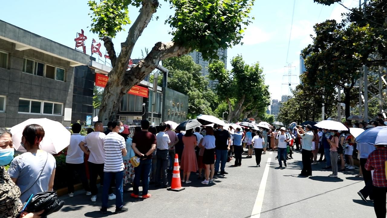 上午,隨著當天首場考試鈴聲的打響,陪考家長們陸續(xù)撤離考點門口的禁區(qū),在樹蔭下耐心等待。炎炎烈日下,校門外的樹蔭成了家長們避暑的最佳場地,甚至有些家長直接站在土堆上,遠眺自己的孩子結束早上考試。