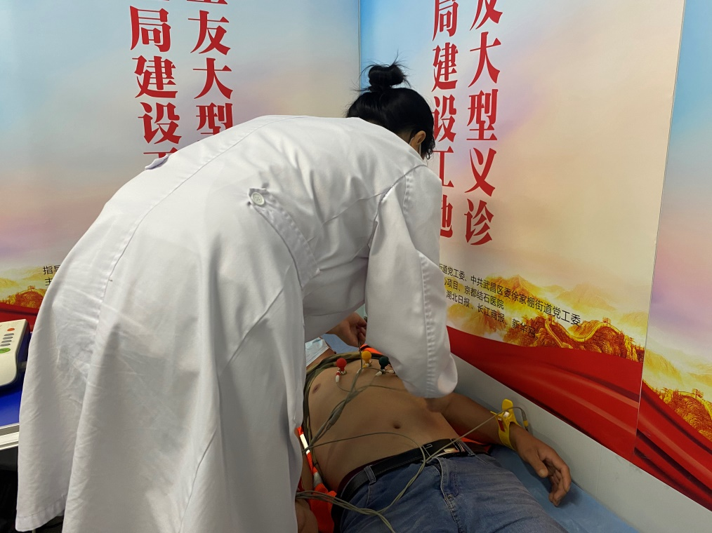 “建筑工人常年從事體力勞動(dòng),且長期處于露天作業(yè)當(dāng)中,出汗量大,如不及時(shí)補(bǔ)充水分,很容易患上泌尿系結(jié)石相關(guān)疾病。而夏季又是泌尿系結(jié)石的高發(fā)期,一旦結(jié)石急性發(fā)作,不僅會(huì)引起劇烈的腎絞痛影響作業(yè)安全,而且結(jié)石梗阻時(shí)間過長引起的積水問題還會(huì)給腎臟帶來嚴(yán)重?fù)p害,重則危及生命。除此之外,高溫之下,由于人體大量排汗,體內(nèi)水分流失多,使血液黏稠度上升,血液循環(huán)受阻,很容易誘發(fā)血栓、心梗、冠心病、中風(fēng)等心腦血管疾病,導(dǎo)致猝死事件發(fā)生。”武漢京都結(jié)石醫(yī)院黨支部書記劉陽光向記者介紹到,為了預(yù)防夏季高溫季節(jié),腎結(jié)石和心梗這兩大高頻高危疾病的發(fā)生,醫(yī)院特別召集兩組隊(duì)伍,分別為現(xiàn)場的廣大工友們提供全程免費(fèi)結(jié)石彩超篩查及心電圖檢查、血壓、心率等項(xiàng)目。