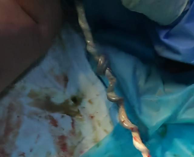 然而,寶寶娩出后,一個(gè)臍帶真結(jié)驚呆了相關(guān)的醫(yī)護(hù)人員。臍帶真結(jié)多先為臍帶纏繞胎體,后因胎兒穿過臍帶套環(huán)而成真結(jié)。若臍帶真結(jié)未拉緊則無狀態(tài),拉緊后胎兒血液循環(huán)受阻可危及胎兒生命。幸運(yùn)的是這個(gè)“真結(jié)”不那么緊,未完全阻滯胎兒的血供,醫(yī)護(hù)人員正確處理后,小陳母女平安。