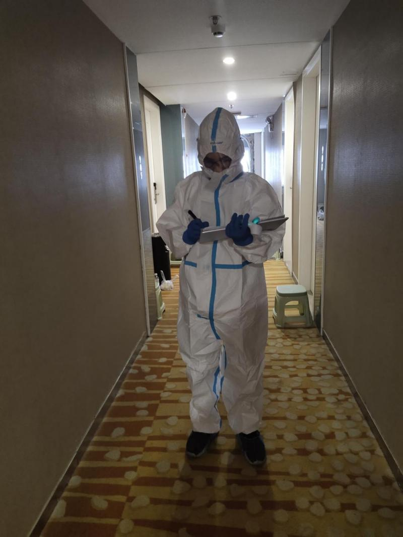 兩位醫(yī)護人員每天要承擔酒店所有隔離人員的測體溫、信息登記上傳、身體觀察、用藥指導、協(xié)助多次核酸檢測等醫(yī)療護理工作。
